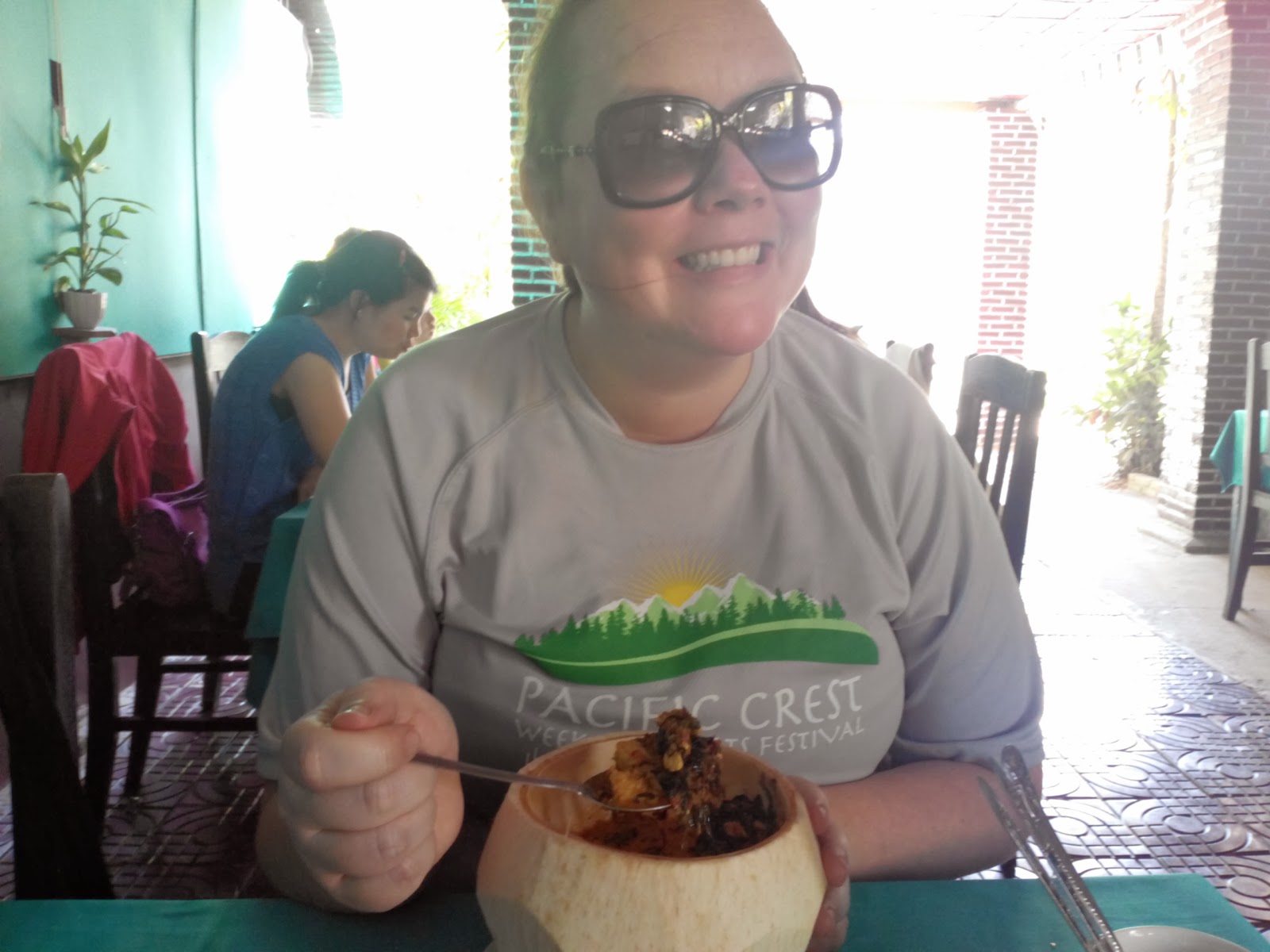 Amok Fish, served in a coconut, this is the national dish - well Amok is. With shreded spinich like greens and a lot of lemon grass, it isn't bad, but now taste-bud-blowing.
